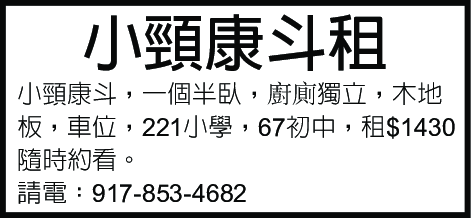 小頸康鬥 一個半臥,櫉厠獨立,木地板,車位221小學67初中, 租 $1430隨時約看 請電917-853-4682