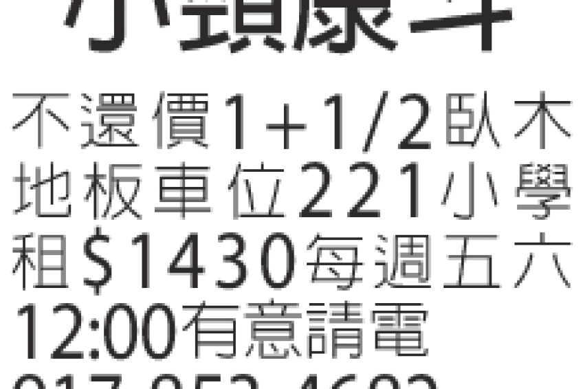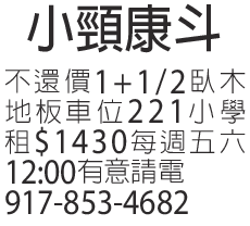 小頸康鬥 不還價1+1/2臥木地板車位221小學租 $1430每週五六12:00有意 請電917-853-4682