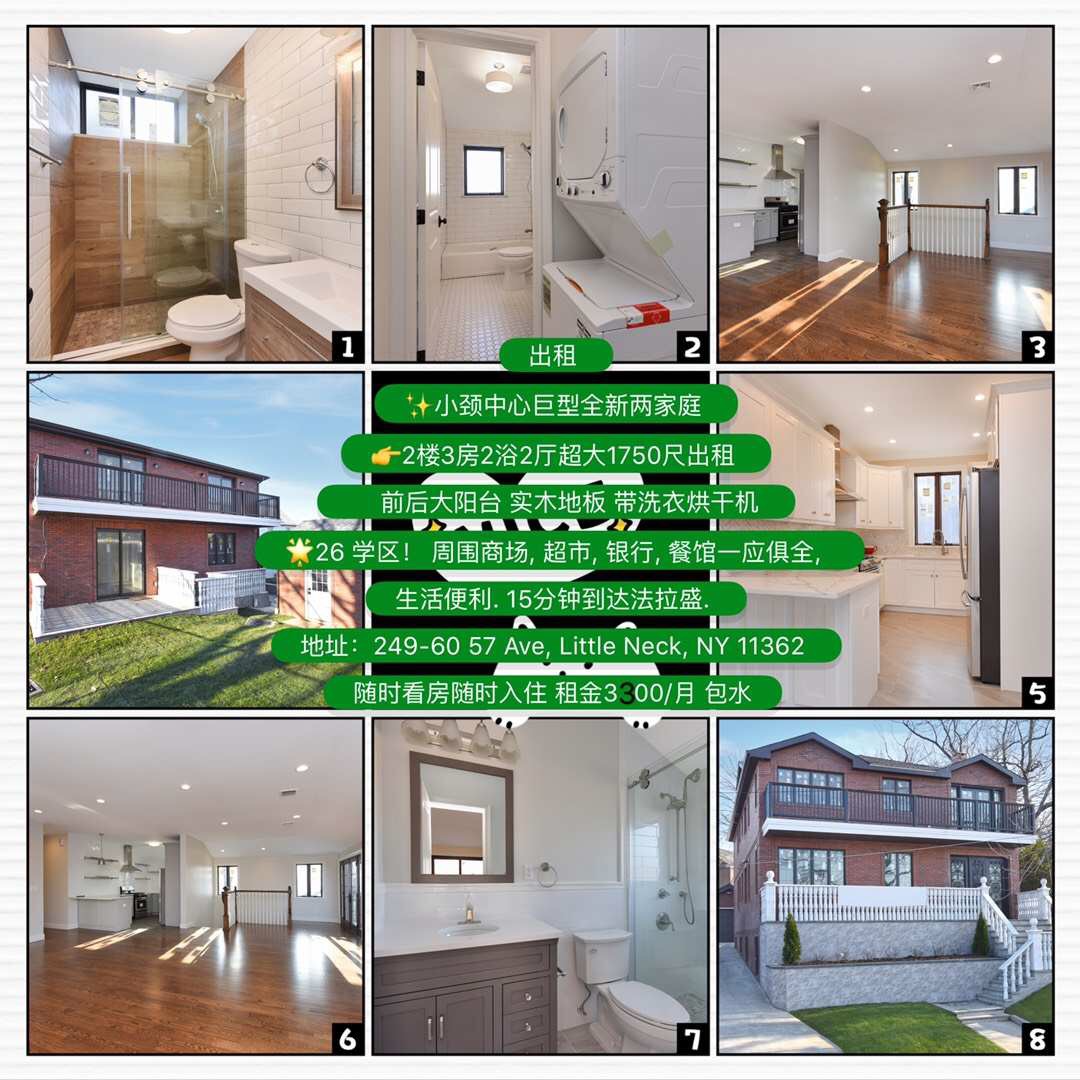 【出租】1⃣️little neck 小颈全新豪宅二楼出租1700多尺 双阳台 三房两浴 带洗衣烘干机 随时入住 需好信用 欢迎各国租客 租3300/月 包水 2⃣️另高地下室出租 三房一浴 2200全包 联系:Steve钟📞516-545-9999