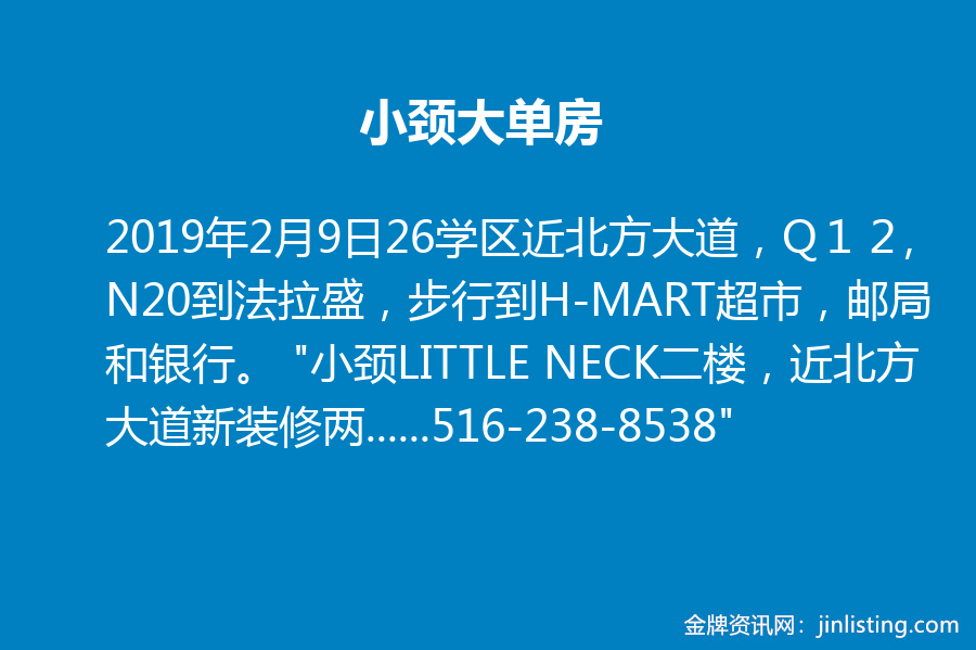 小颈大单房-26学区近北方大道,Q12,N20到法拉盛,步行到H-MART超市,邮局和银行。 “小颈LITTLE NECK二楼,近北方大道新装修两面窗空调大单房,附近26学区67中学,圣玛丽高中,科多索高中,QCC大学。 大储物橱,大衣橱,暖气足,易泊车,室内洗衣烘干机。步行一条街可乘Q12N20到法拉盛缅街,步行7分钟乘LIRR火车到曼哈顿。 步行3分钟到图书馆,中西超市,邮局和银行。社区环境好,堪比法拉盛。 简单家私,高速上网WIFI。提包即住。适女士和学生。电话看房:516-238-8538”