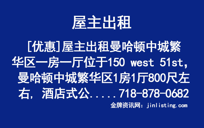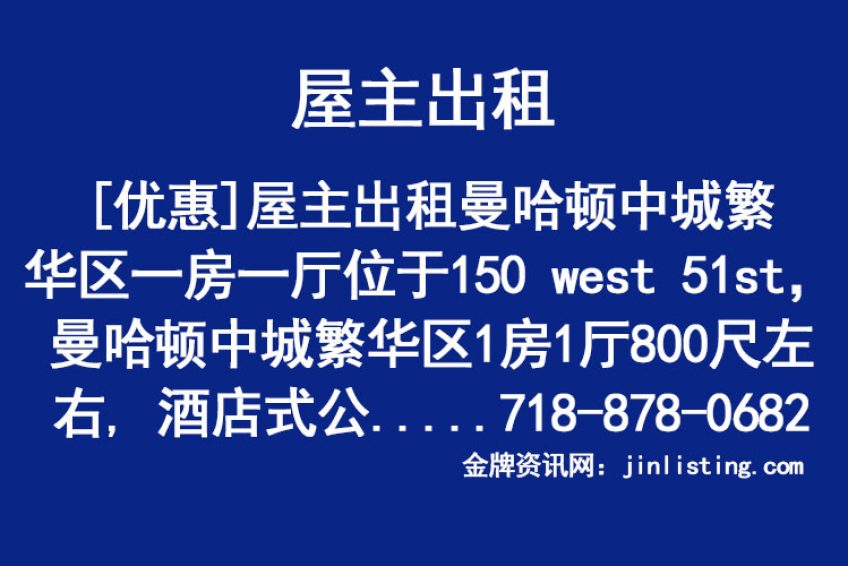 [优惠]屋主出租曼哈顿中城繁华区一房一厅 位于150 west 51st,曼哈顿中城繁华区1房1厅800尺左右, 酒店式公寓16楼,有24小时警卫,健身房,洗衣房,室內家具(全新沙发和床上用品),电器,网络,设备齐全,拎包入住. 屋主直接出租, 无中介费, 9/1/2021入住, 月租$2800, 租期至少6个月, 只要租客信用好有兴趣, 价格还可商量(租客offer),保证低于市场价, 有诚意者请联系: 718-878-0682 微信号 NYWeChat2021 或 gcr2804@hotmail.com