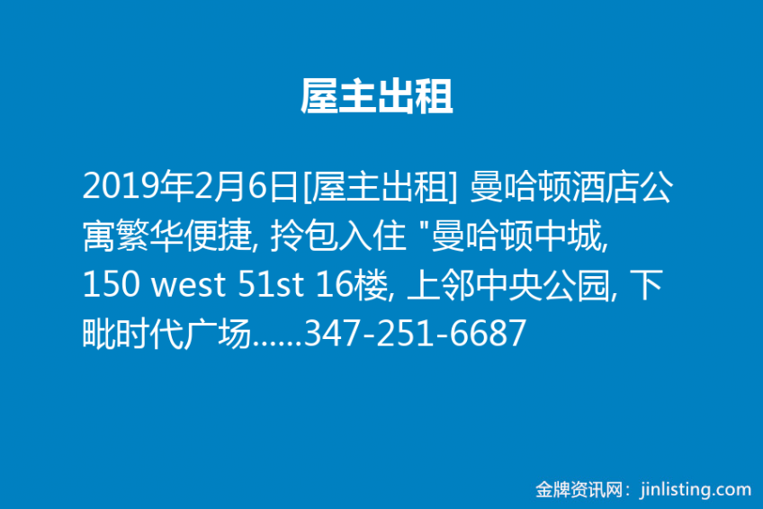 [屋主出租] 曼哈顿酒店公寓繁华便捷, 拎包入住 “曼哈顿中城, 150 west 51st 16楼, 上邻中央公园, 下毗时代广场, 地理位置极其优越, 交通非常方便! 一室一厅, 700平方英尺, 24小时门卫, 洗衣房, 健身房, 各类家具, 餐具配备齐全! 水, 电, 暖气, 网络一应俱全! 4/1/2019可以入住, $3500/月, 租期至少半年, 一年以上有优惠, 押金2月, 需信用审查, 房东直接出租, 无中介费! 联系电话: 347-251-6687 邮箱: gcr2804@hotmail.com”