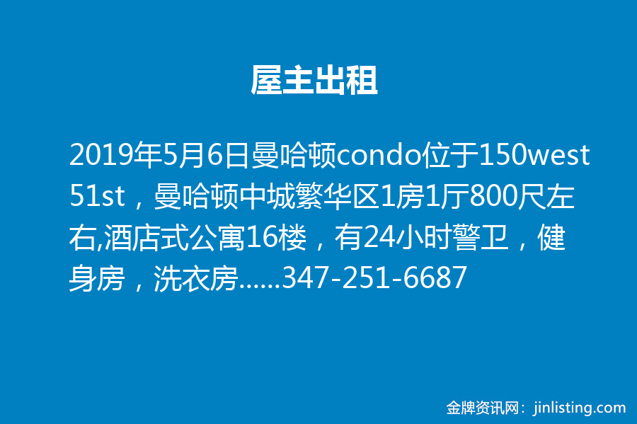 屋主出租曼哈顿condo 位于150 west 51st,曼哈顿中城繁华区1房1厅800尺左右, 酒店式公寓16楼,有24小时警卫,健身房,洗衣房,室內家具,电器,网络,设备齐全,拎包入住. 屋主直接出租, 无中介费, 7/7/2019开始, 月租$3500, 只要租客信用好有兴趣, 价格还可商量(租客offer),保证低于市场价, 有诚意者请联系 347-251-6687