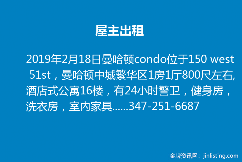 屋主出租曼哈顿condo 位于150 west 51st,曼哈顿中城繁华区1房1厅800尺左右, 酒店式公寓16楼,有24小时警卫,健身房,洗衣房,室內家具,电器,网络,设备齐全,拎包入住. 屋主直接出租, 无中介费, 只要租客信用好有兴趣, 价格面议(租客offer),保证低于市场价, 有诚意者请联系 347-251-6687