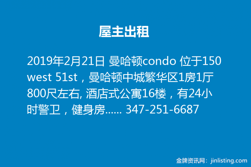 屋主出租曼哈顿condo 位于150 west 51st,曼哈顿中城繁华区1房1厅800尺左右, 酒店式公寓16楼,有24小时警卫,健身房,洗衣房,室內家具,电器,网络,设备齐全,拎包入住. 屋主直接出租, 无中介费, 只要租客信用好有兴趣, 价格面议(租客offer),保证低于市场价, 有诚意者请联系 347-251-6687