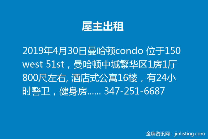 屋主出租曼哈顿condo 位于150 west 51st,曼哈顿中城繁华区1房1厅800尺左右, 酒店式公寓16楼,有24小时警卫,健身房,洗衣房,室內家具,电器,网络,设备齐全,拎包入住. 屋主直接出租, 无中介费, 7/7/2019开始, 月租$3500, 只要租客信用好有兴趣, 价格还可商量(租客offer),保证低于市场价, 有诚意者请联系 347-251-6687