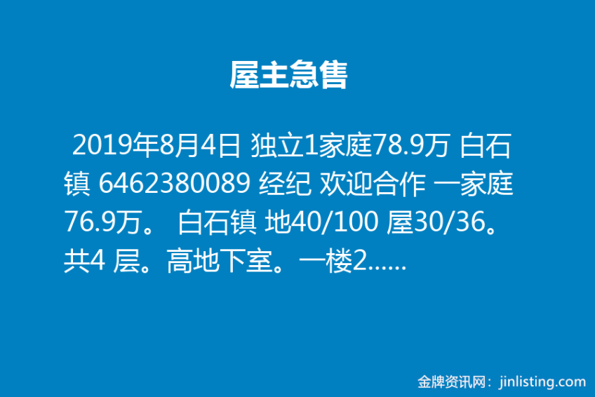 屋主急售 独立1家庭78.9万 白石镇 6462380089 经纪 欢迎合作 一家庭76.9万。 白石镇 地40/100 屋30/36。 共4 层。高地下室。一楼2房一浴 2楼4 房1浴 阁楼可以做一房。大型一家庭2080尺。有钥匙随时约看。14ave。140街