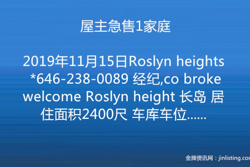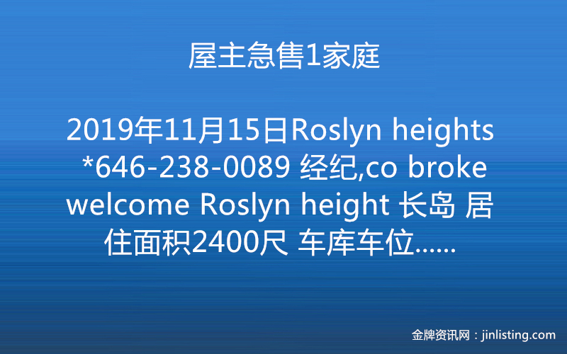 屋主急售1家庭 Roslyn heights **646-238-0089 经纪, co broke welcome Roslyn height 长岛 居住面积2400尺 车库车位 屋主精心打造的超温馨别墅,位于安逸舒适小区,区内多医生,运动明星,工程师…. 小区内有专人打理草地及庭院,免去您除草铲雪的烦恼。长岛有名的富饶社区,以顶级学区及便利的交通(缅街开车仅20分钟,不塞车)