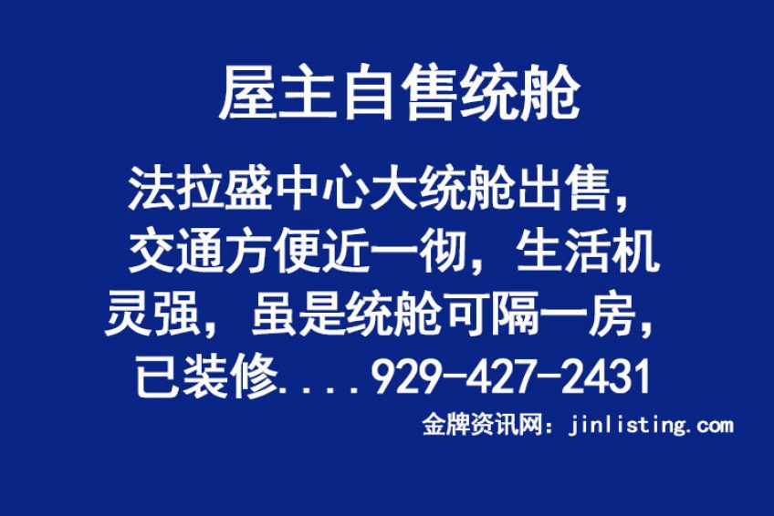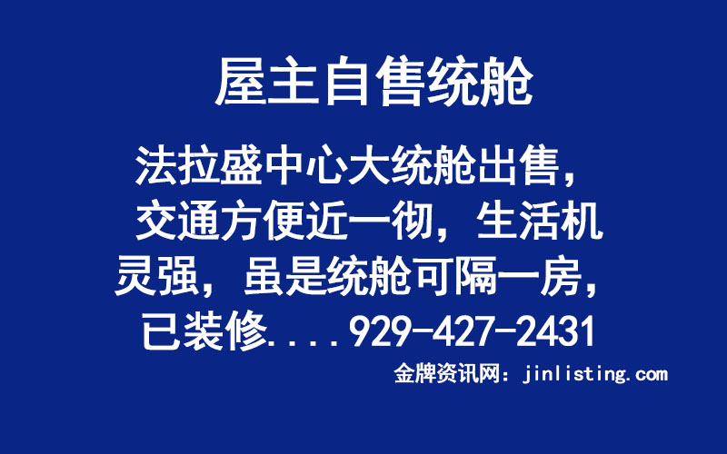 屋主自售统舱 法拉盛中心大统舱出售,交通方便近一彻,生活机灵强,虽是统舱可隔一房,已装修过售价28万;电话;929-427-2431