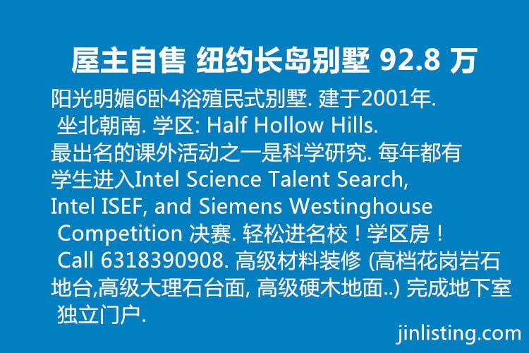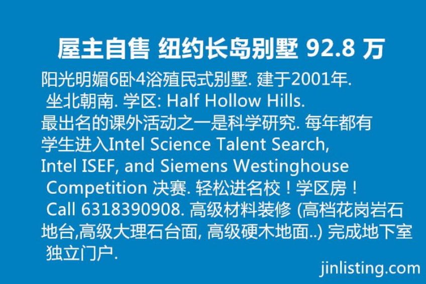 阳光明媚6卧4浴殖民式别墅. 建于2001年. 坐北朝南. 学区: Half Hollow Hills. 最出名的课外活动之一是科学研究. 每年都有学生进入Intel Science Talent Search, Intel ISEF, and Siemens Westinghouse Competition 决赛. 轻松进名校 ! 学区房 ! 学区房 ! Call 6318390908. 高级材料装修 (高档花岗岩石地台,高级大理石台面, 高级硬木地面..) 完成地下室 独立门户.