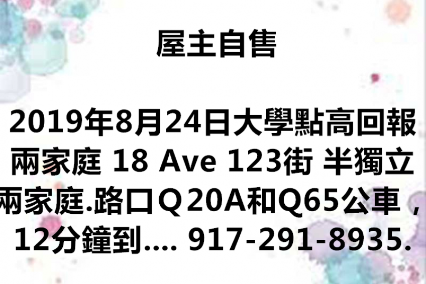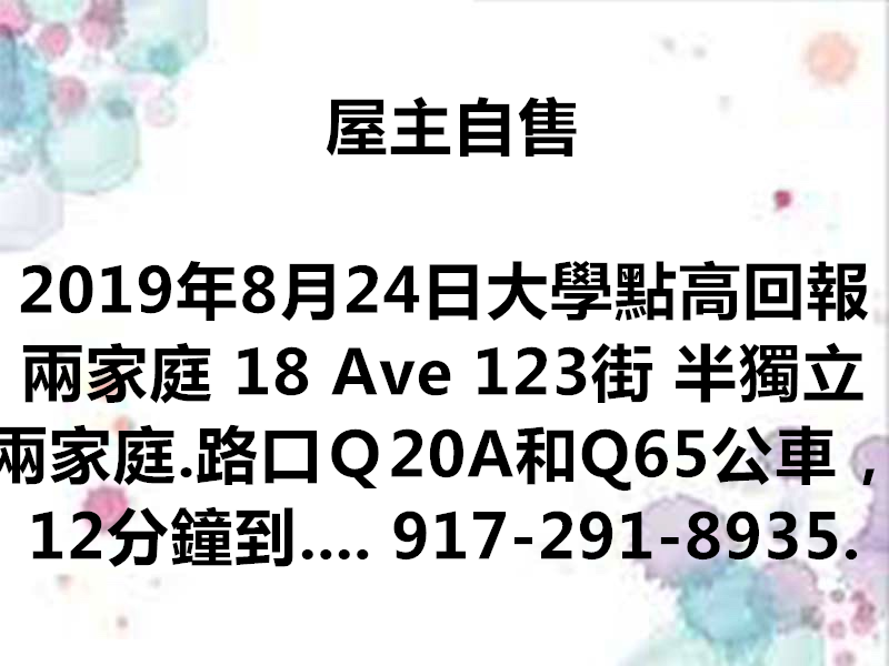 屋主自售,大學點高回報兩家庭 18 Ave 123街 半獨立兩家庭. 路口Q20A和Q65 公車,12分鐘到7號地鐵. 步行15分鐘到BJs. 路口公園。 旁邊是大學點商業街. 新裝修,光亮多窗. 25×100 地, R4A, 可擴建. 閣樓可站立, 有大窗, 可做浴室及2個房間. 院子有獨立小房子. 無車道車庫, 街趴容易. 地稅低, 回報率高. 風水佳,出入方便,極易出租,經濟實惠,投資上選. $93萬9,歡迎出價. 請聯繫: 917-291-8935. 若無人接聽,請留言或短信.