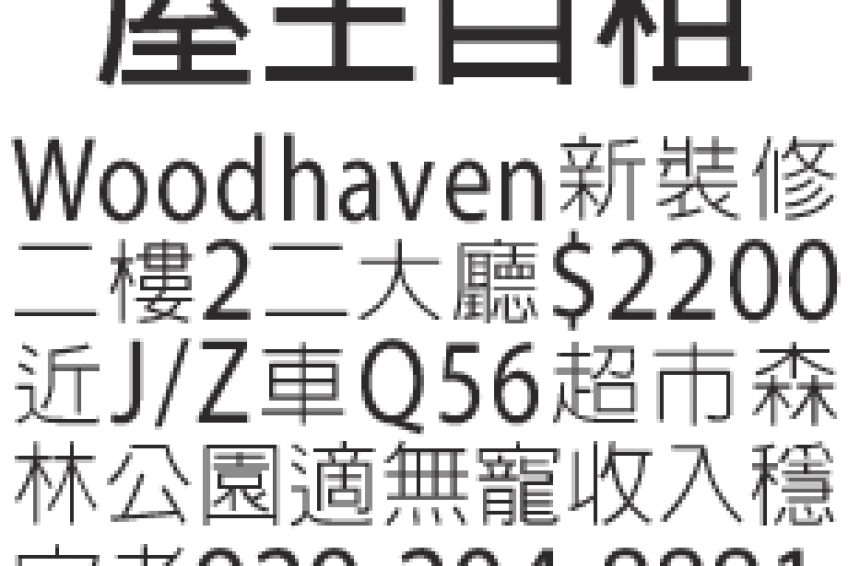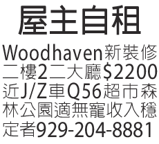 Woodhaven全新裝修二樓兩房兩大廳 $2200/月 近J,Z車 Q56,超市,近森林公園 鬧中取靜, 適合無寵 有穩定收入者 請電:929-204-8881