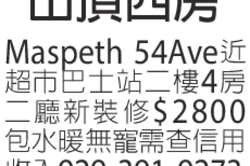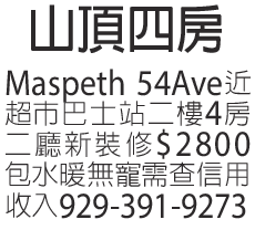 Maspeth 54th Av 近超市巴士站,二樓四房二廳新裝修,包水暖2800,無寵需查信用收入請電929-391-9273