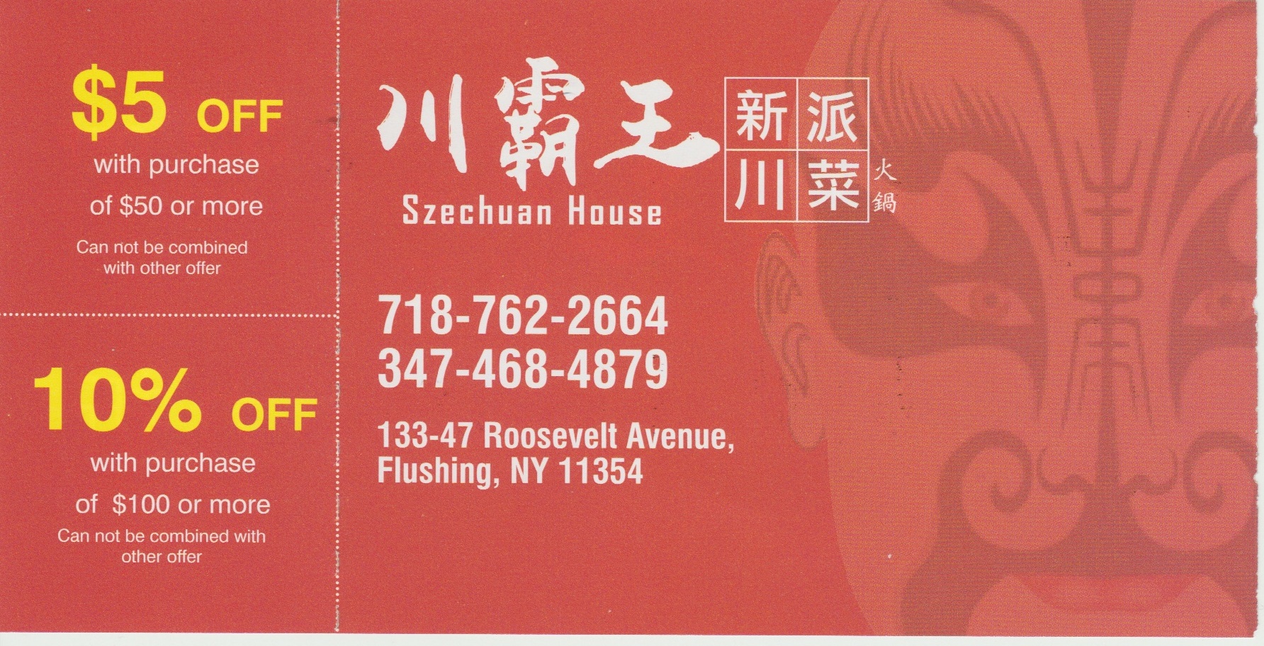 新張開業川菜館,川霸王。環境優美,服務至上,菜品美味。新張開業期間大酬賓。凡在本店消費40以上者可享受大肉蟹 4.99/lb。或者9折優惠!並且同時我們有飲品贈送。 ,可樂 雪碧,檸檬汁,或 ice tea。這樣的優惠您還等待什麼!
