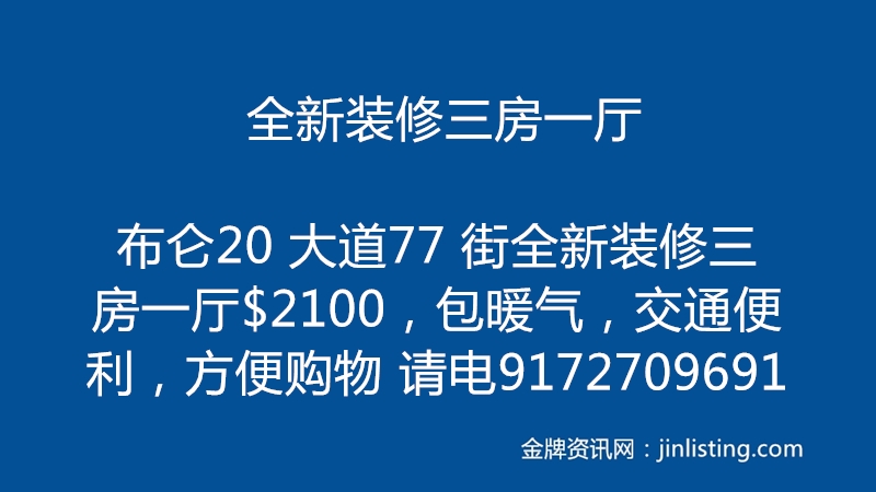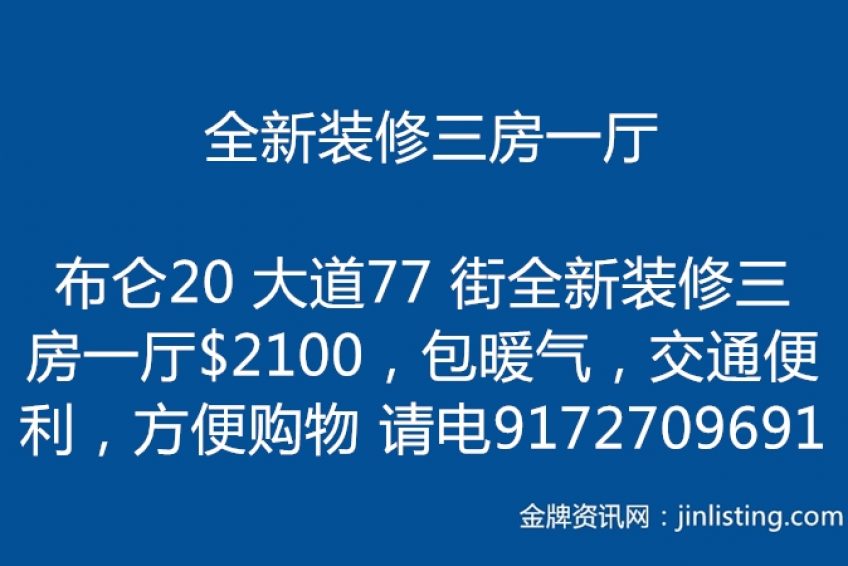 布仑20 大道77 街全新装修三房一厅$2100,包暖气,交通便利,方便购物 请电9172709691