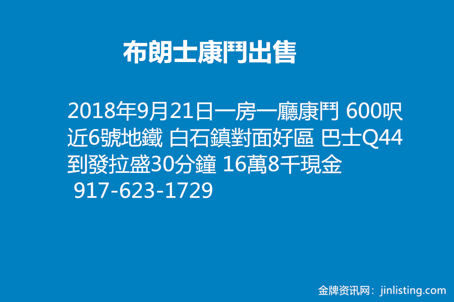布朗士 康鬥 1睡房 16萬8千    917-623-1729