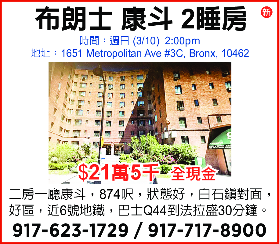 布朗士 康鬥 2睡房 917-623-1729 917-717-8900