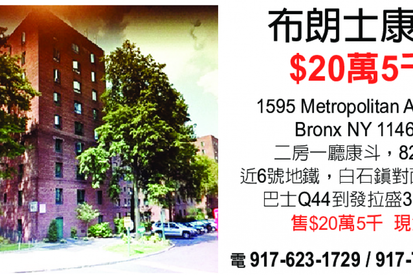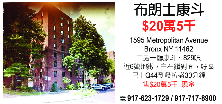 二房一廳康鬥,829呎 近6號地鐵,白石鎮對面,好區 巴士Q44到發拉盛30分鐘 20萬8千, 現金 1595 Metropolitan Avenue Bronx NY 11462 917-623-1729, 917-717-8900