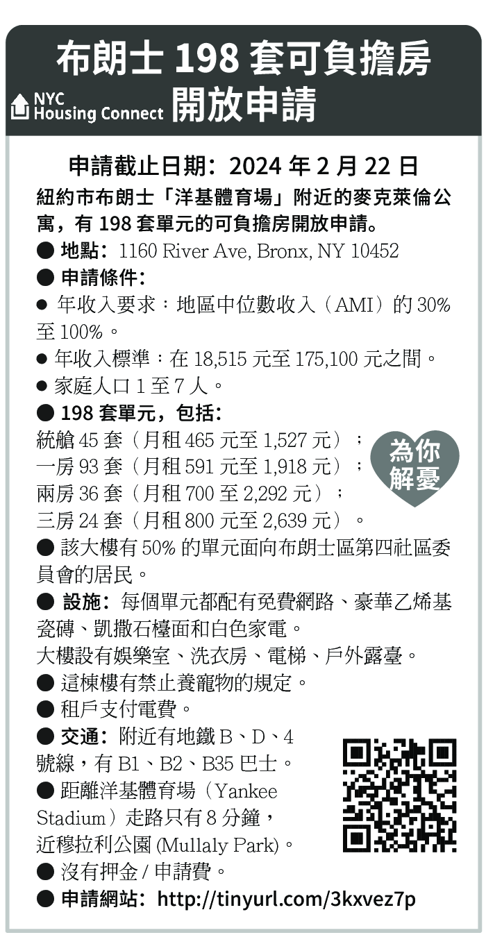 布朗士 198 套可負擔房 開放申請