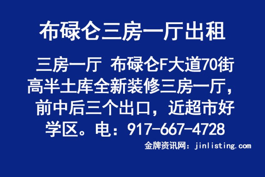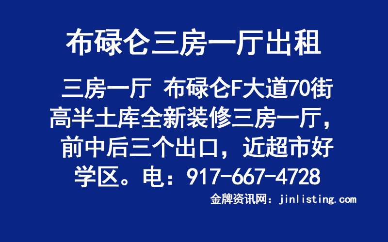 三房一厅 布碌仑F大道70街高半土库全新装修三房一厅,前中后三个出口,近超市好学区。电:917-667-4728