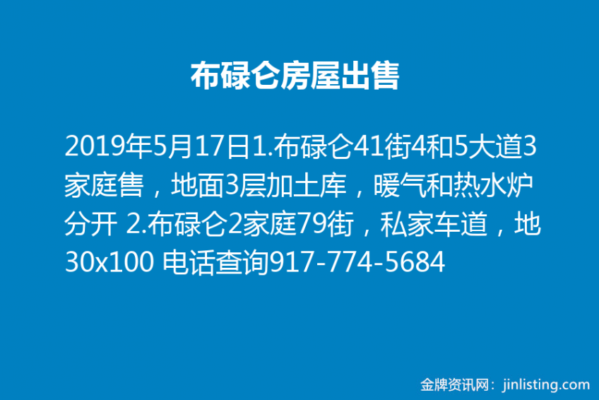 布碌仑房屋出售 1.布碌仑41街4和5大道3家庭售,地面3层加土库,暖气和热水炉分开 2.布碌仑2家庭79街,私家车道,地30×100 电话查询917-774-5684