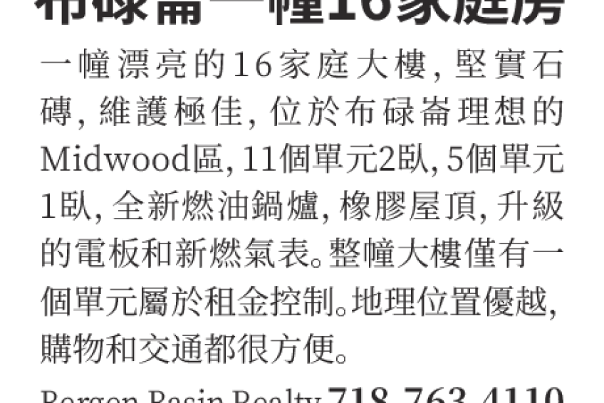 一幢漂亮的16家庭大樓, 堅實石磚,維護極佳,位于布魯崙理想的Midwood區,