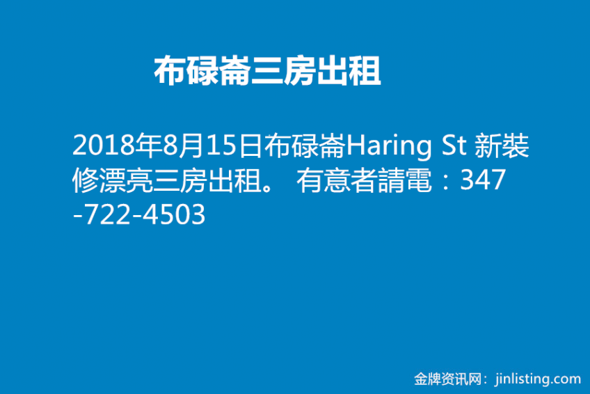布碌崙Haring St 新裝修漂亮三房出租。 有意者請電:347-722-4503