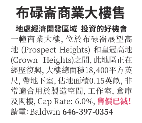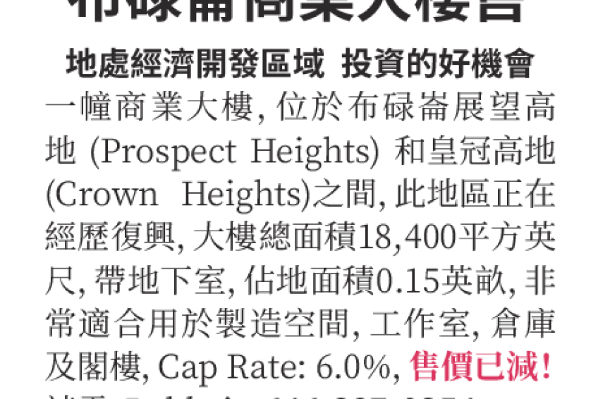 一幢商業大樓,位於布碌崙的展望高地(Prospect Heights)和皇冠高地(Crown Heights)之間,此地區正在經歷復興,大樓總面積18,400平方英尺,帶地下室,佔地面積0.15英畝,非常適合用於製造空間,工作室, 倉庫及閣樓,Cap Rate: 6.0%,售價已減!