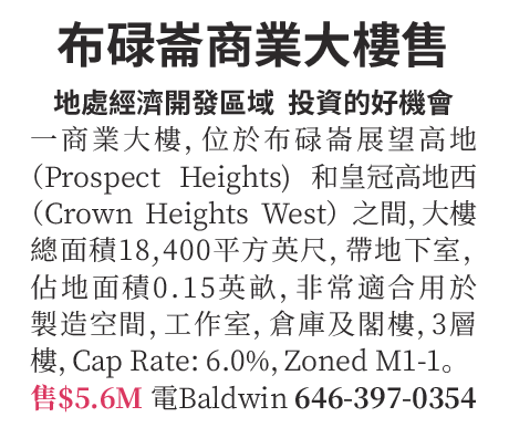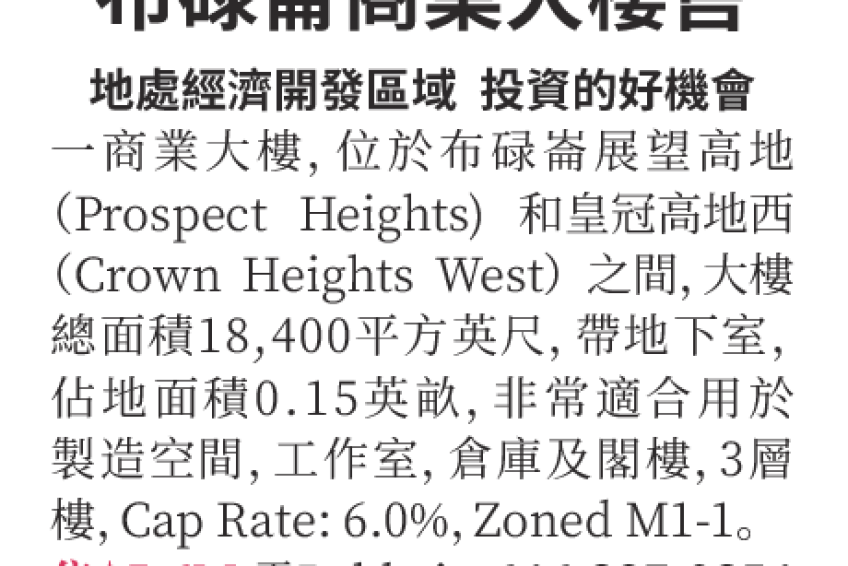 一商業大樓,位布碌崙展望高地(Prospect Heights)和皇冠高地西(Crown Heights West)之間, 大樓總面積18,400平方英尺,帶地下室,佔地面積0.15英畝,非常適合用於製造空間,工作室, 倉庫及閣樓,3 層樓,Cap Rate: 6.0%, Zoned M1-1, 售$5.6M,