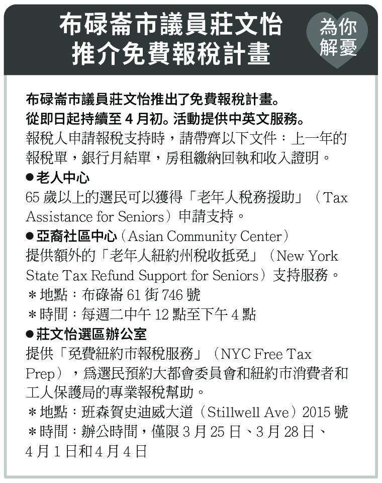 布碌崙市議員莊文怡推出了免費報稅計畫。