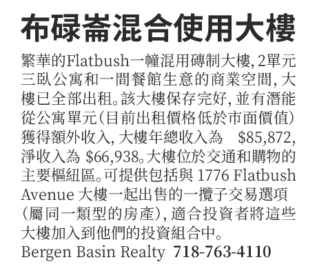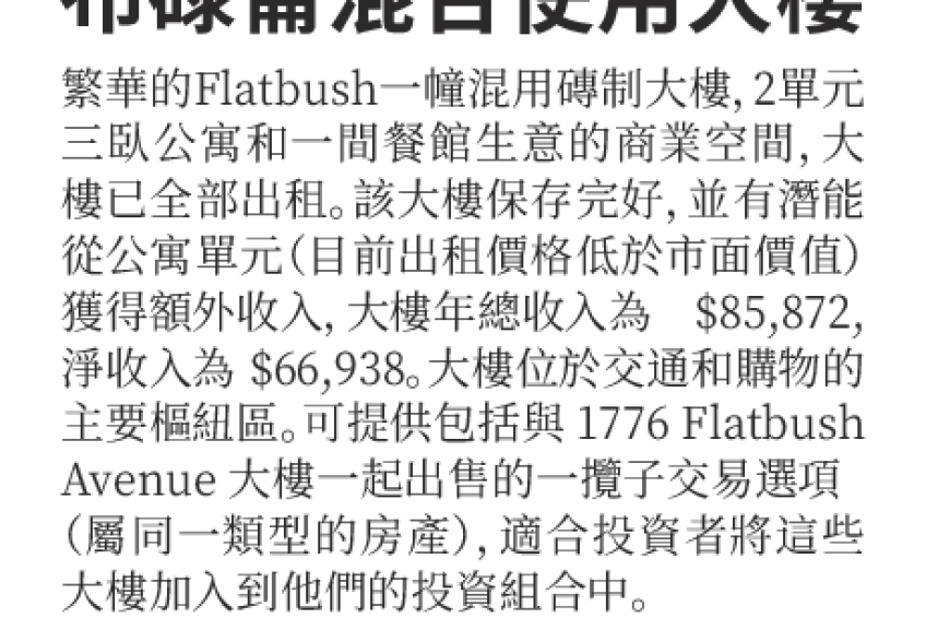 布魯崙繁華的FLATBUSH,一幢混用磚制漂亮大樓,擁有2單元三臥公寓和一間餐館生意的商業空間,大樓已全部出租。 該大樓保存完好,並有潛能從公寓單元(目前出租價格低於市面價值)獲得額外收入,大樓年總收入為 $85,872, 淨收入為 $66,938。 該大樓位於交通和購物的主要樞紐區(距離交界處不遠)。可提供包括與1776 Flatbush Avenue 大樓一起出售的一攬子交易選項(屬同一類型的房產),非常適合投資者將這二幢大樓加人到他們的投資組合中。