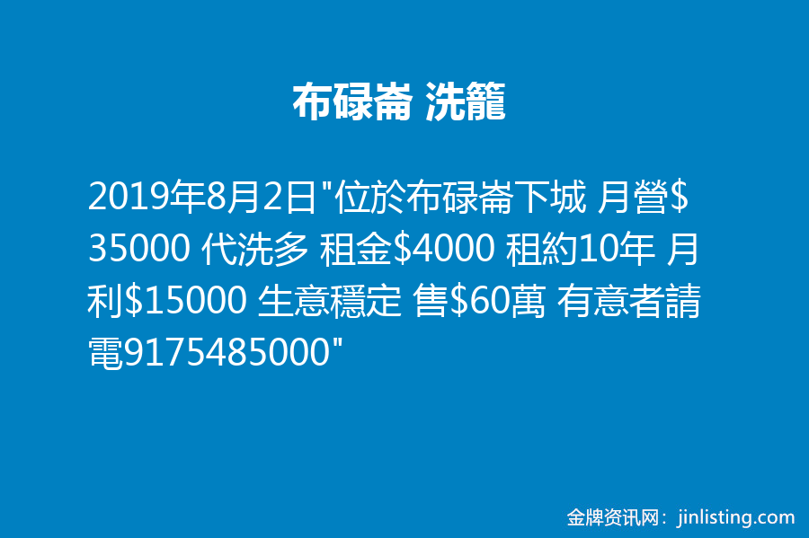 布碌崙 洗籠 “位於布碌崙下城 月營$35000 代洗多 租金$4000 租約10年 月利$15000 生意穩定 售$60萬 有意者請電9175485000”