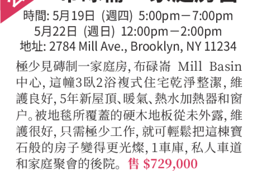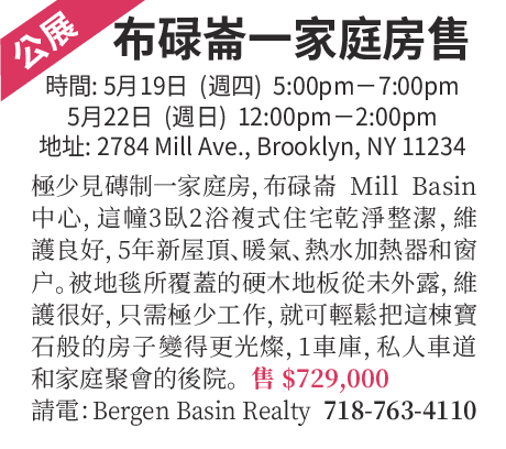 極為少見磚制一家庭房,布碌崙Mill Basin中心,這幢3臥2浴複式住宅乾淨整潔,維護良好, 5 年新屋頂,暖氣,熱水加熱器和窗戶。被地毯所覆蓋的硬木地板從未外露,維護很好,只需極少工作,就可輕鬆把這棟寶石般的房子變得更光燦,1車庫,私人車道和家庭聚會的後院。售:$729,000