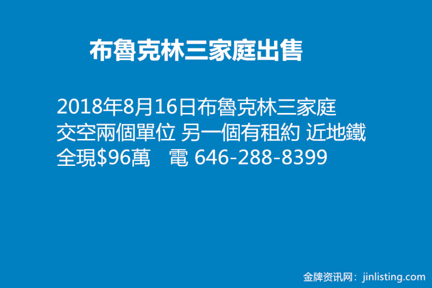時間:隨時預約 地址:9## Madison street ,Bushwick ,11221 布魯克林三家庭,地18.5×100, 房18.5×50,地稅2800/年, 交空兩個單位,另一個有租約。近地鐵,全現$96萬。 電:646-288-8399