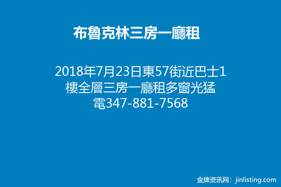東57街近B3 B9 B100巴士1樓全層三房一廳租多窗光猛有意請電347-881-7568或917-605-1213