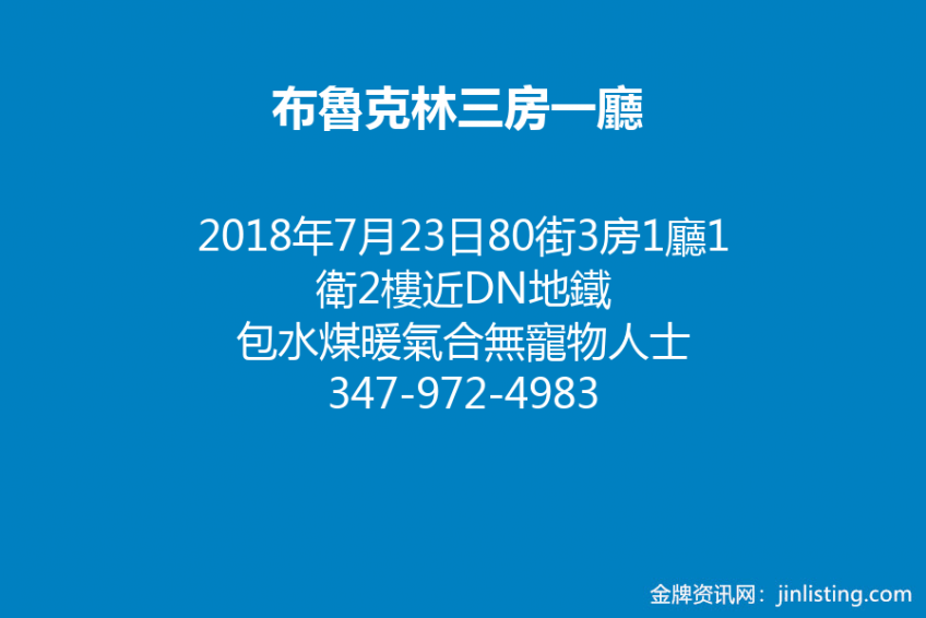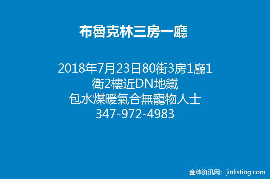 Bay Pkwy 80街3房1廳1衛2樓近DN地鐵包水煤氣暖氣$1800合無寵物人士請電347-972-4983