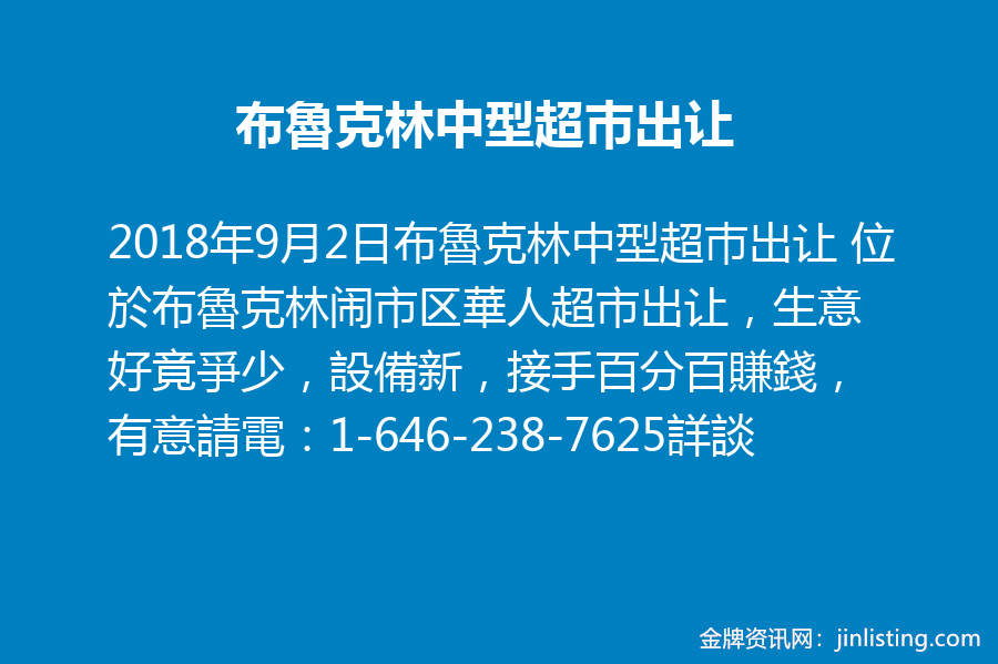 布魯克林中型超巿出让 位於布魯克林闹市区華人超市出让,生意好竟爭少,設備新,接手百分百賺錢,有意請電:1-646-238-7625詳談