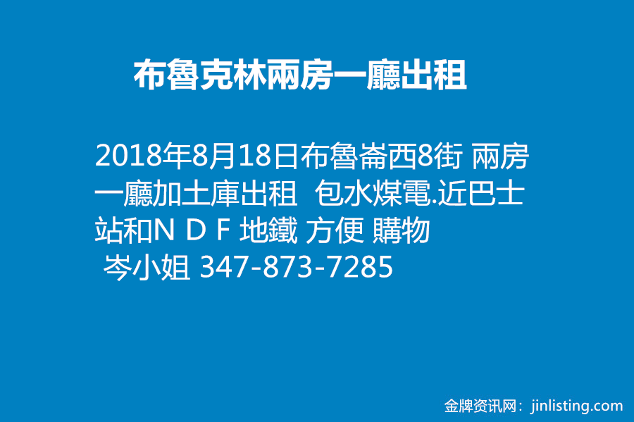獨立門戶 布魯崙西8街,Highlawn Ave 夾 Ave S 大道,兩房一廳加土庫出租 ,包水煤電.近 巴士站和N D F 地鐵,方便 購物 岑小姐 347-873-7285