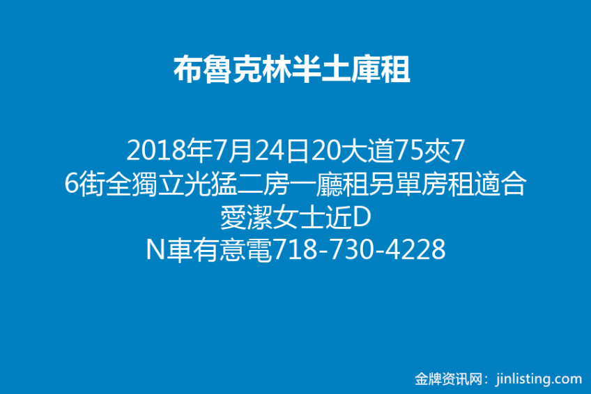 20大道75夾76街全獨立光猛二房一廳租另單房租適合愛潔女士近D N車有意電718-730-4228