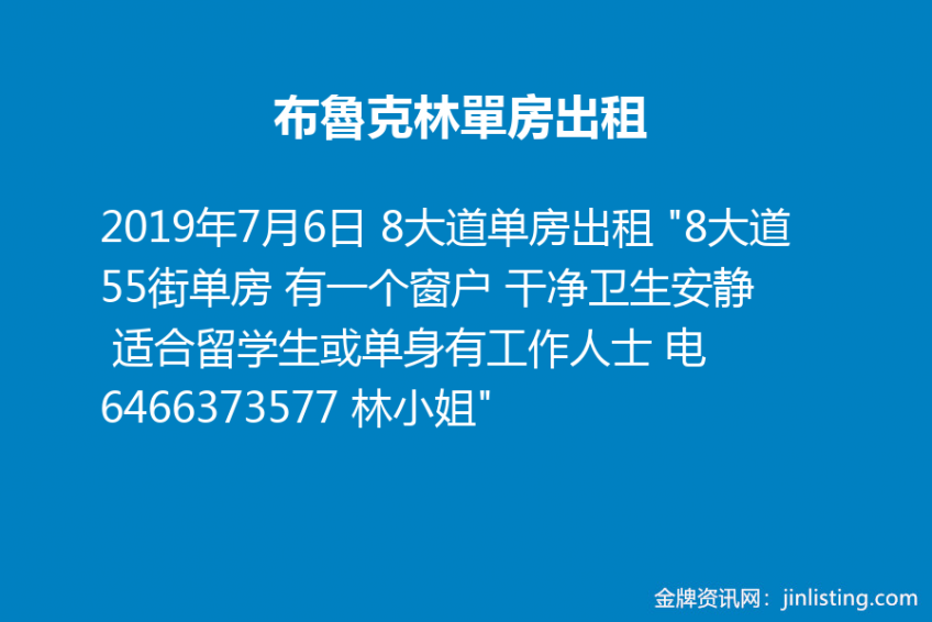 8大道单房出租 “8大道55街单房 有一个窗户 干净卫生安静 适合留学生或单身有工作人士 电6466373577 林小姐”