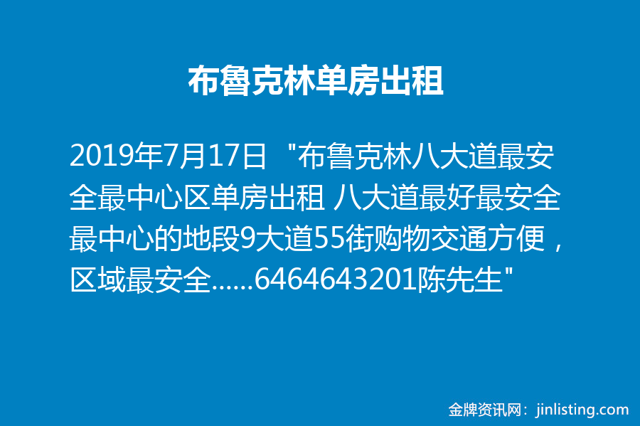 “布鲁克林八大道最安全最中心区单房出租 八大道最好最安全最中心的地段9大道55街购物交通方便,区域最安全!有一房间出租!房间较新,大窗户,大衣柜!独门独户(新装修过的房子)出入非常方便!人口少!大客厅!煮方便!有意请联系6464643201陈先生”