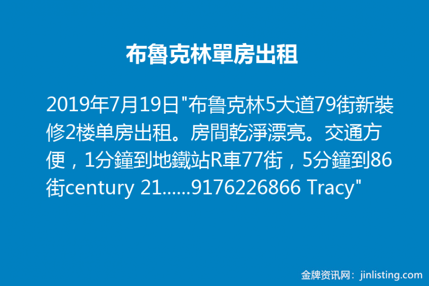 “布鲁克林5大道79街新裝修2楼单房出租。房間乾淨漂亮。交通方便,1分鐘到地鐵站R車77街,5分鐘到86 街century 21 購物中心,附近有很多餐廳銀行超市,還有电影院。學生優先。 請電9176226866 Tracy”