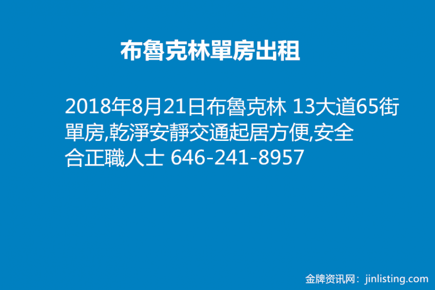 布魯克林 13大道65街單房,乾淨安靜交通起居方便,安全,合正職人士 646-241-8957