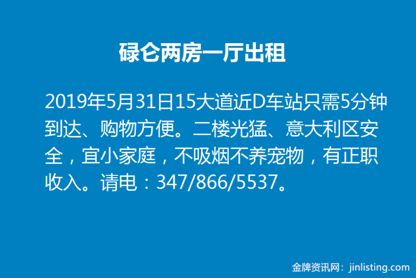 有碌仑两房一厅出租 15大道近D车站只需5分钟到达、购物方便。二楼光猛、意大利区安全,宜小家庭,不吸烟不养宠物,有正职收入。请电:347/866/5537。