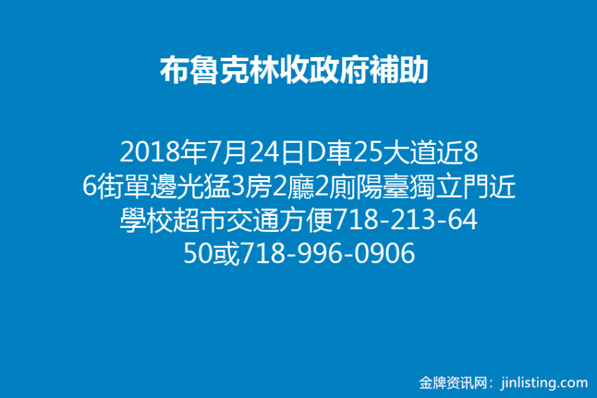 D車25大道近86街單邊光猛3房2廳2廁陽臺獨立門近學校超市交通方便718-213-6450或718-996-0906