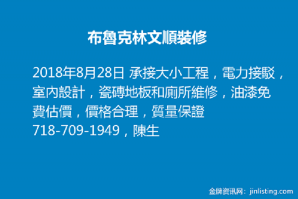 承接大小工程,電力接駁,室內設計,瓷磚地板和廁所維修,油漆免費估價,價格合理,質量保證718-709-1949,陳生