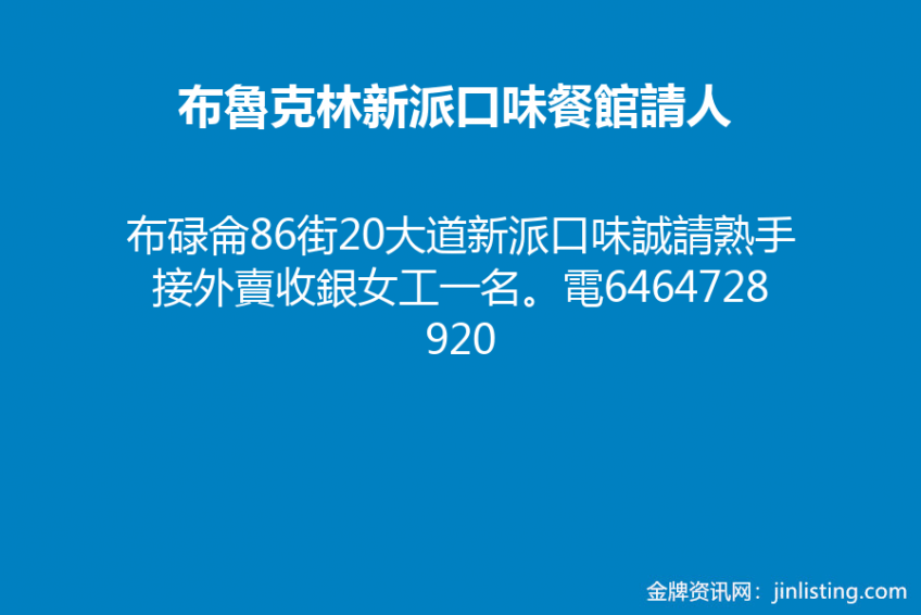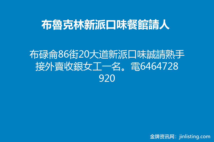 布碌侖86街20大道新派口味誠請熟手接外賣收銀女工一名。電6464728920