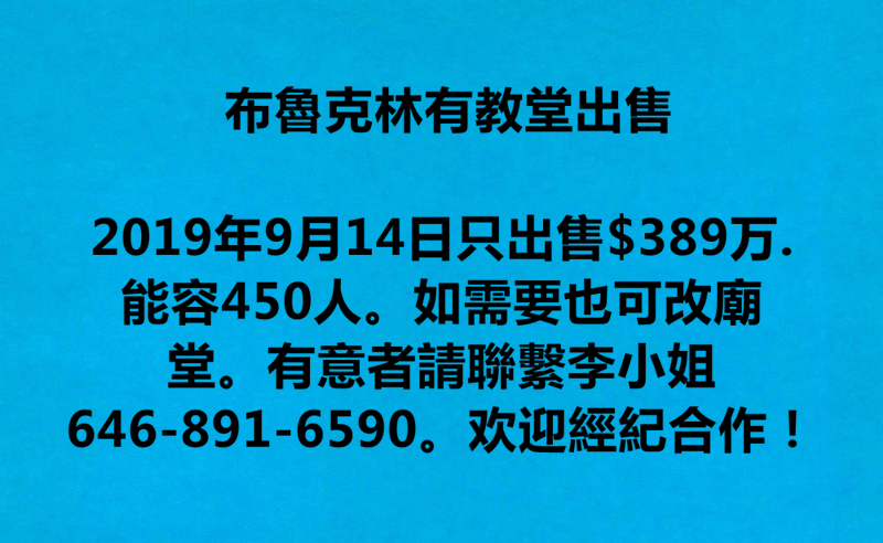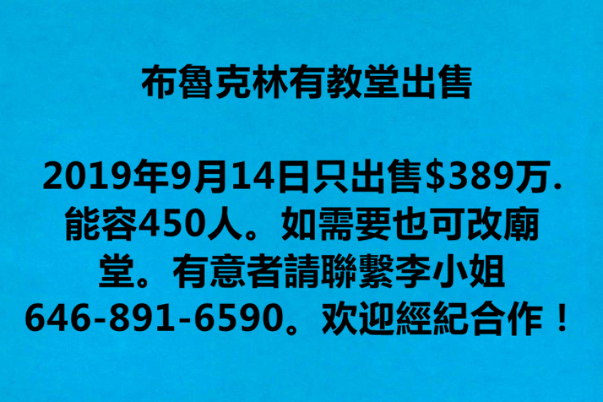 布魯克林有教堂出售,只出售$389万. 能容450人。如需要也可改廟堂。有意者請聯繫李小姐646-891-6590。欢迎經紀合作!