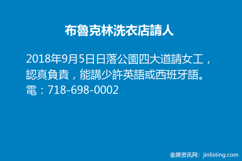 日落公園四大道請女工,認真負責,能講少許英語或西班牙語。電:718-698-0002