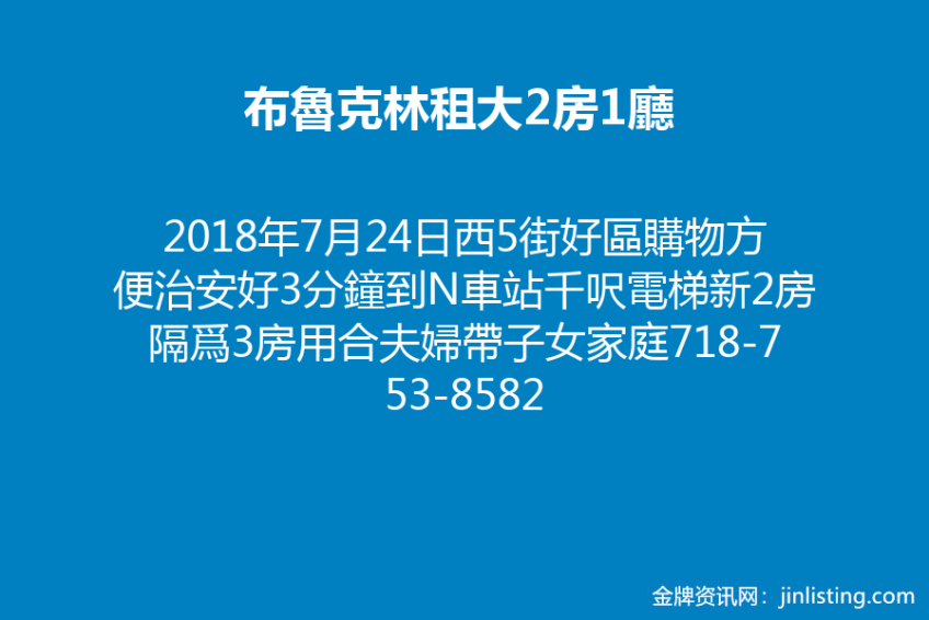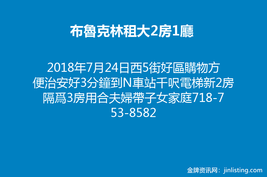 布魯克林租 西5街好區購物方便治安好3分鐘到N車站千呎電梯新2房隔爲3房用合夫婦帶子女家庭718-753-8582